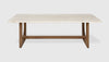 - Rounded corners on honed travertine tabletop soften the table edges.