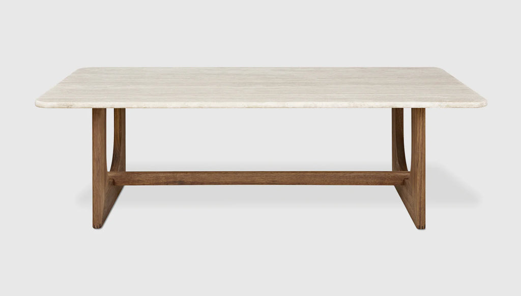 The Portico Coffee Table showcases an alluring travertine slab surface and elegantly crafted solid wood base in Walnut or White Oak. The warm, natural travertine grain creates an organic beauty that is unique to each design, reinforced by gently curved corners. These curves are mirrored in the base - with graceful forms and thoughtful proportions that blend the materials into a unified, sculptural accent. The Portico Coffee Table is available in square or rectangular size. Also available as an End Table.