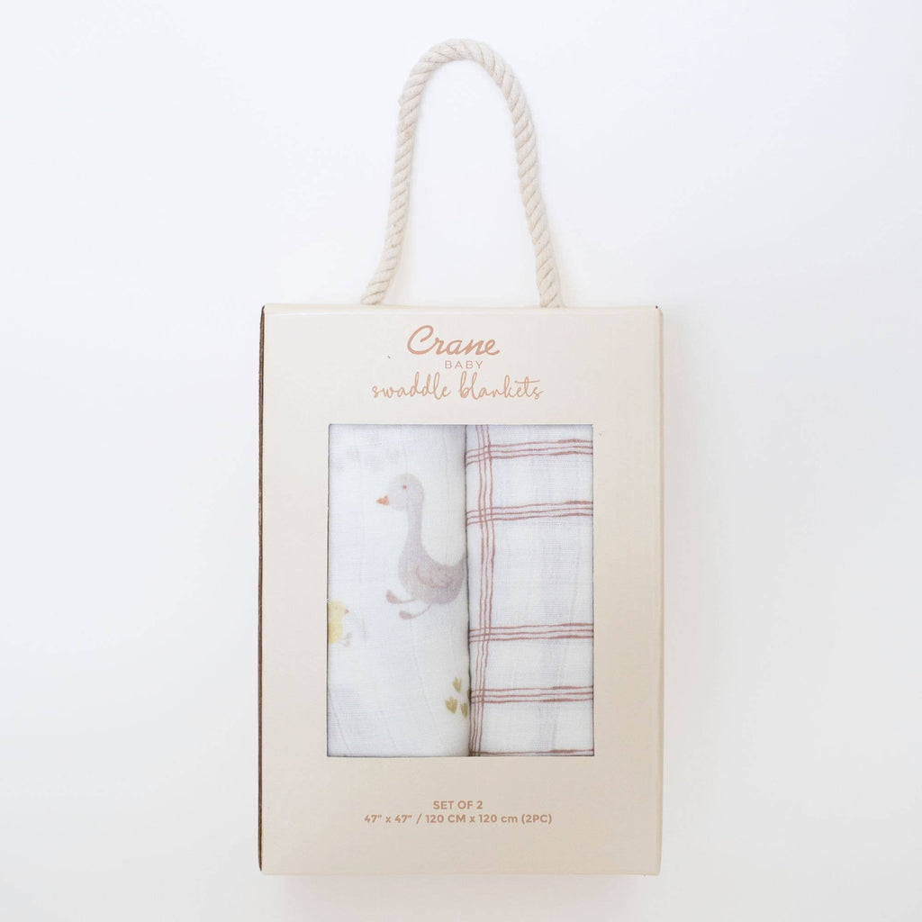 Bring vintage vibes to baby’s world with this charming swaddle duo. Featuring a sweet goose print and classic plaid check, each swaddle is made from breathable, pre-washed cotton muslin for ultimate softness and comfort. Ideal for swaddling, cuddling, or lying down for tummy time, this set is a cozy, country-inspired nursery staple.