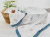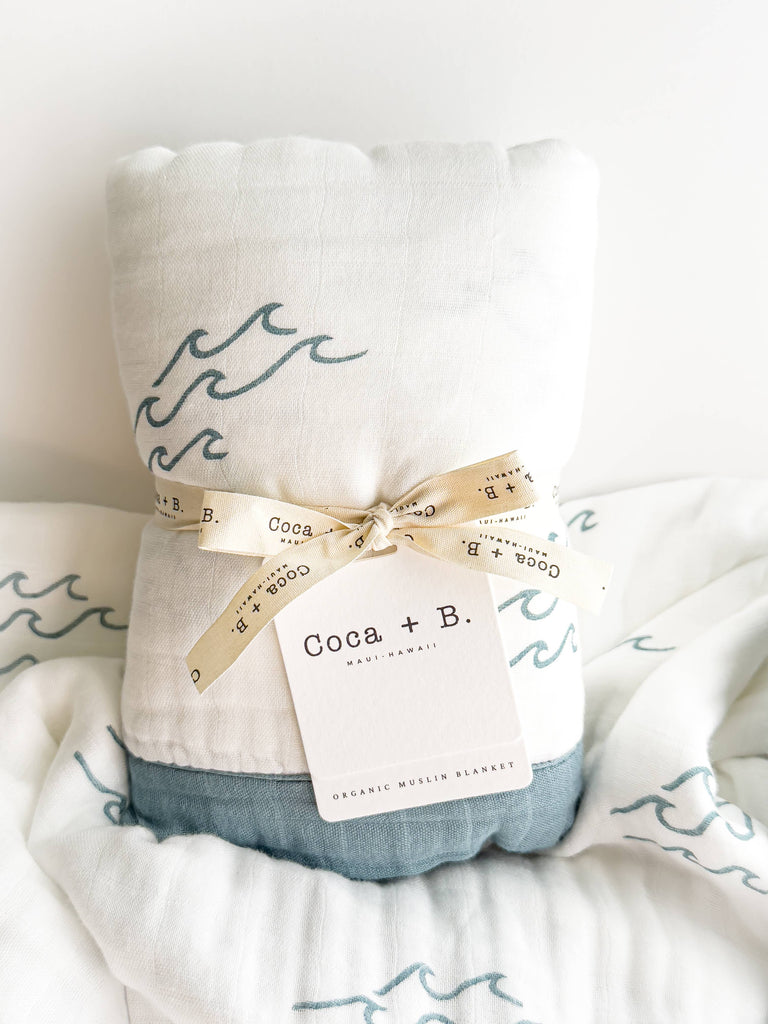 Our Wave Print Muslin Baby Blanket offers 6 incredibly soft layers of added warmth and comfort while still maintaining that incredibly buttery softness bamboo is known for.  Not only incredibly cozy, breathable, midweight, and moisture-wicking but its sustainable organic bamboo + cotton fabric also helps preserve our environment. With a little extra weight, it's perfect for cooler environments. Each blanket is beautifully packaged in eco-friendly organic cotton ribbon with deluxe cardstock and ready to gift.