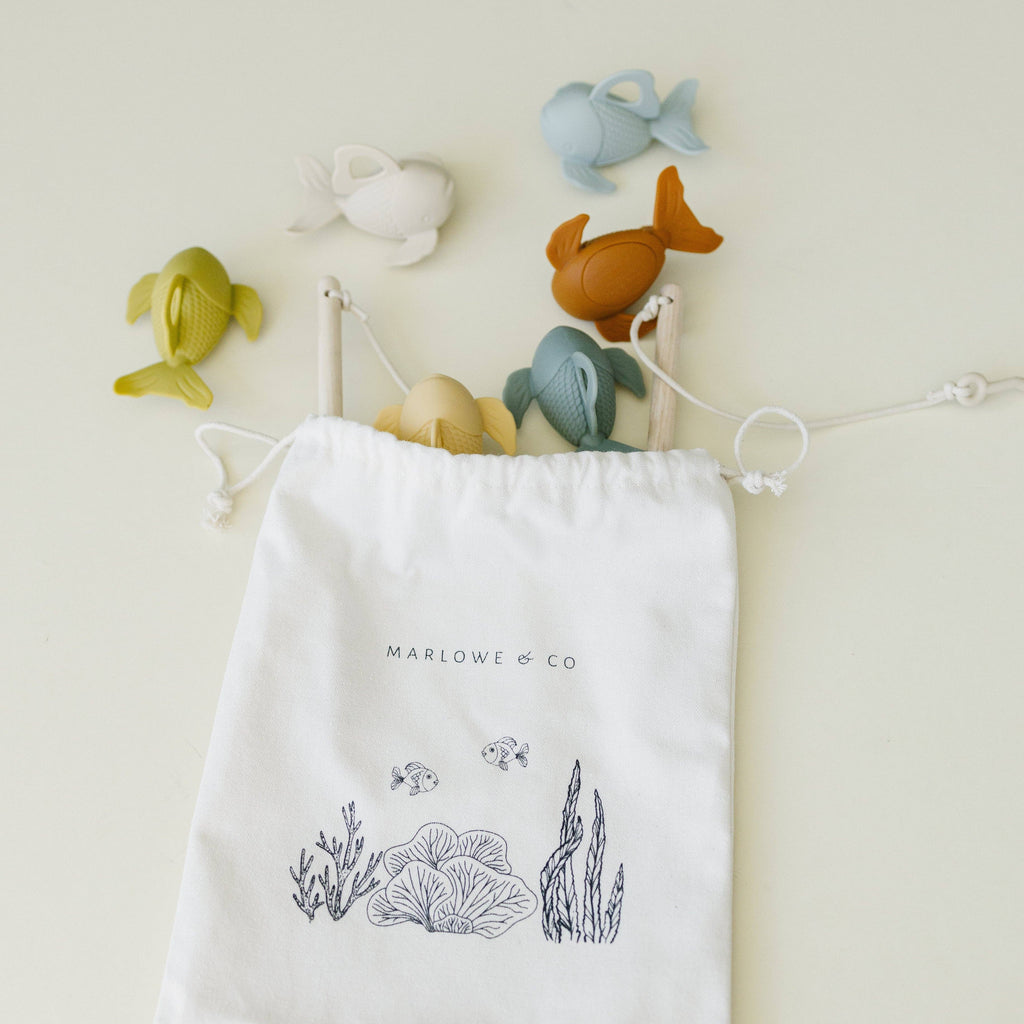 This set is a perfect gift, packaged in a cotton storage bag and a giftable box. Features: ~ Fish are 100% food-grade silicone