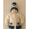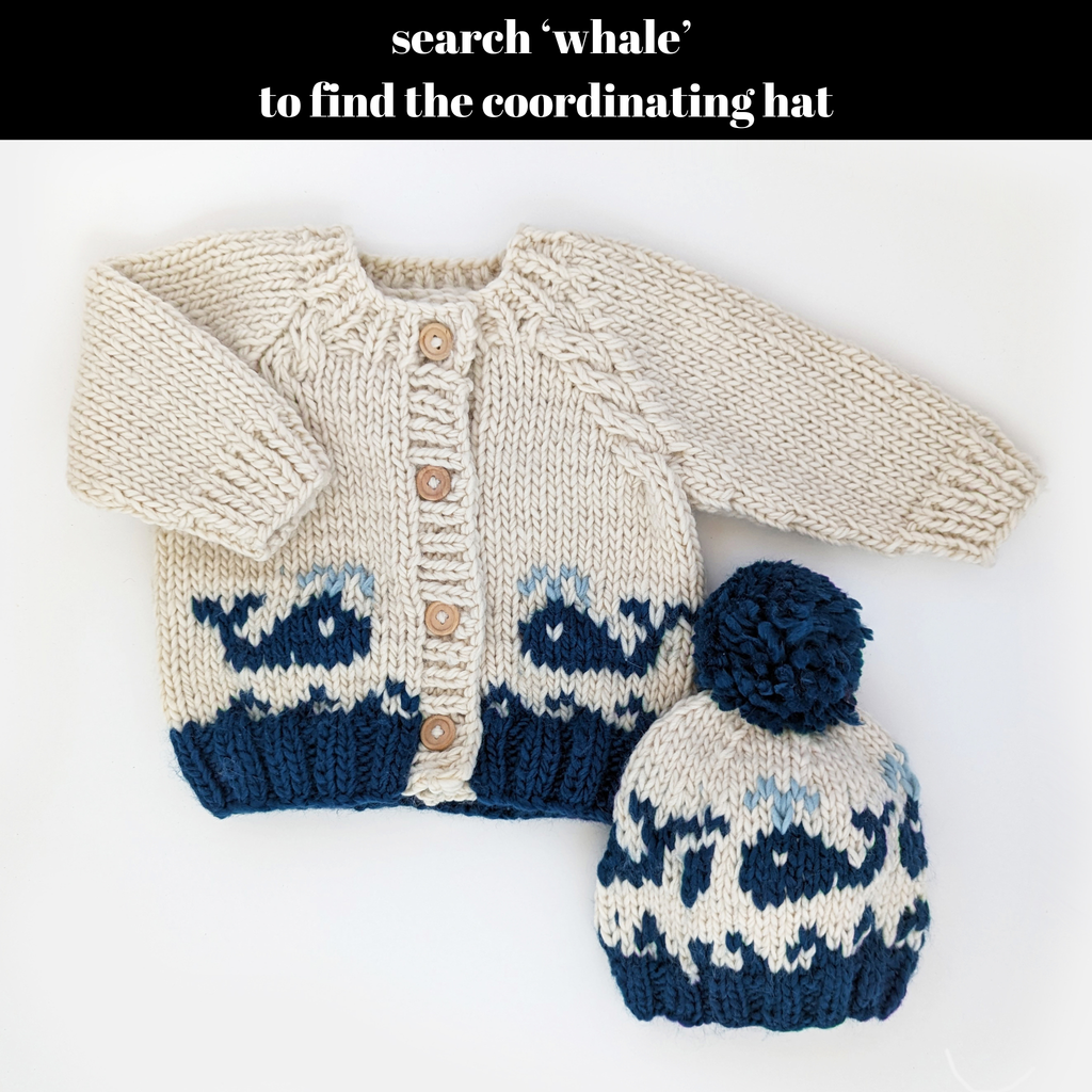 Here's a delightful hand-knit cardigan, adorned with charming blue whales with spouts of water, swimming in water on a natural-hued background. This playful cardigan is designed with attention to detail, featuring natural wood buttons for closure and cable-trimmed raglan sleeves. Don't miss out on our matching whale beanie hat to complete the look. Our sweaters are partially knit from recycled, sustainable Polyester yarn made from plastic bottles. We are on a mission to help reduce the world's plastic pollution problem ♻ • 100% Acrylic • Cold handwash