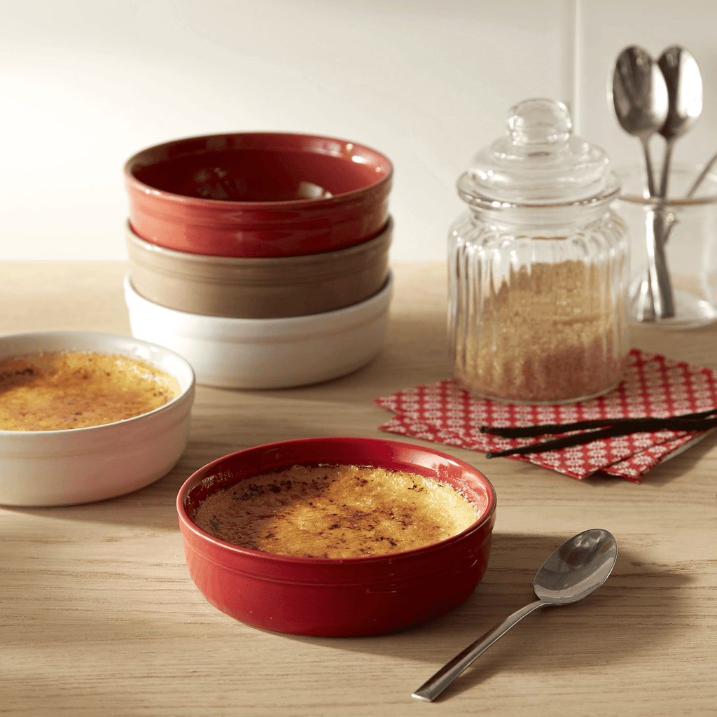 Our colorful crème brûlée dishes have a perfectly flat surface and a diameter of 12cm, ideal for caramelizing sugar with a blowtorch or hot iron. Whether it’s a goat's cheese crème brûlée with honey or a tomato and mozzarella crumble as starter, or a traditional crème brûlée as dessert, you will get a perfect result every time. They are quite shallow for even heat distribution, and perfectly stackable for gaining space in the fridge.