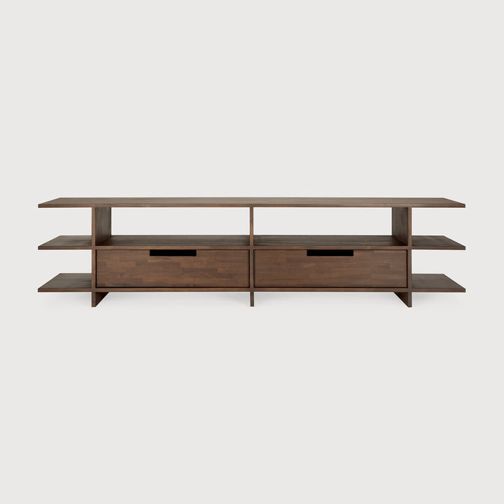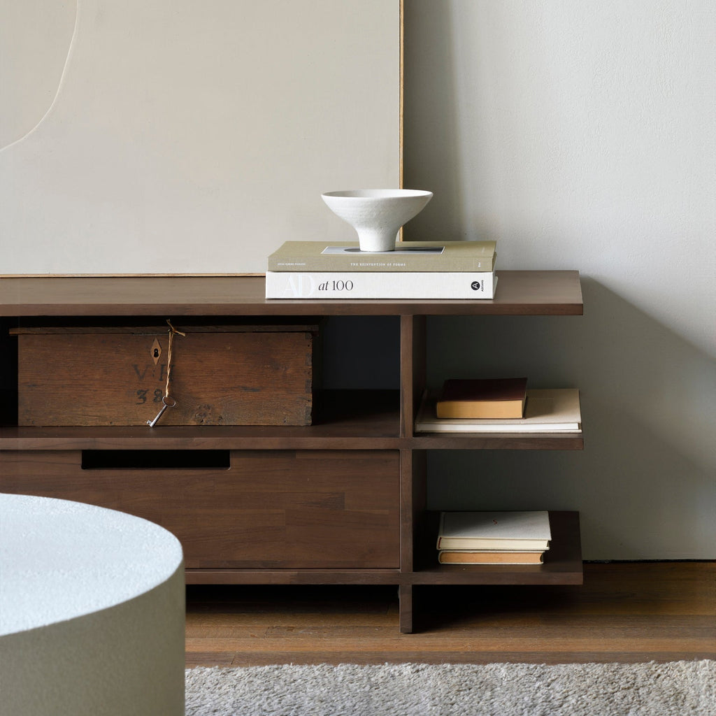 The Kabuki TV Cupboard\Console strikes a perfect balance of symmetry and elegance, crafted from durable varnished teak for lasting appeal. Designed by the multitalented commercial artist Reynaldo Zapp, this piece radiates a sense of peace and harmony, making it a serene addition to any living space. Its thoughtful design seamlessly combines functionality with artistic flair.