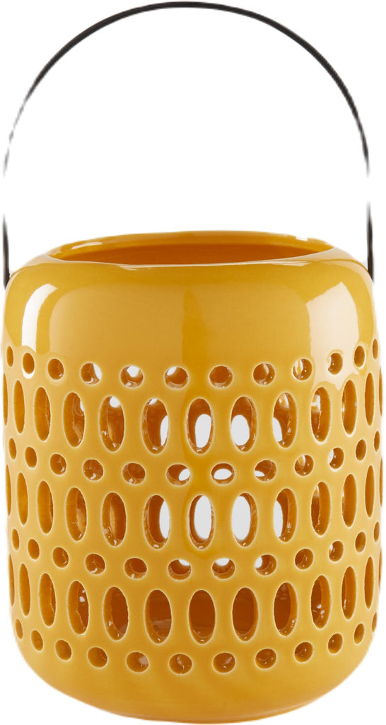 The Small Yellow Fiesta Lantern is as playful as a morning cartoon! Crafted from ceramic with a shimmering, lakeside blue glaze, and lined with little oval windows for your light to shine through! It will brighten your summer evenings in more ways than one!