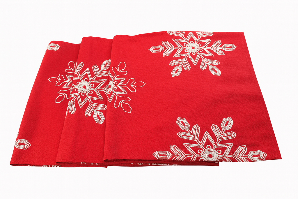Featuring red on polyester, delicate embroidery adds a wonderfully modern update to this classic design and adds dimension and texture to your table. This gorgeous snowflake table runner is the perfect choice for tasteful kitchen linens for your everyday use or holiday decoration. Holiday accent is sure to add a delicate touch to your table. Size: 16"X54", 16"X70", 16"X90", 16"X108", 16"X120" Material: Polyester Care: Machine wash