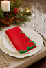 Size: 20"W x 20"L Color: Red, GreenMaterial: 100% Cotton Care: Warm Machine Wash.. Do Not Bleach. Do Not Tumble Dry. Line Dry Only. Medium Iron