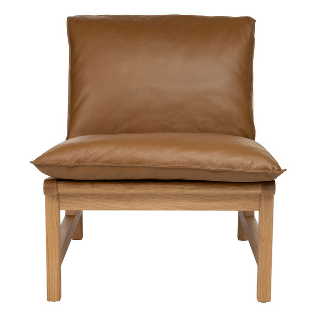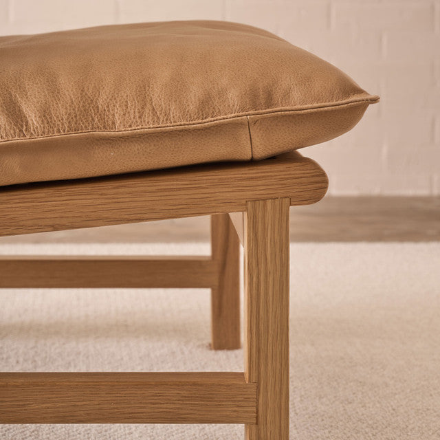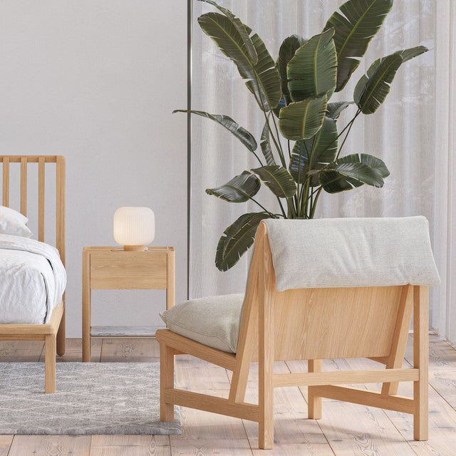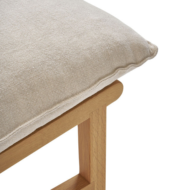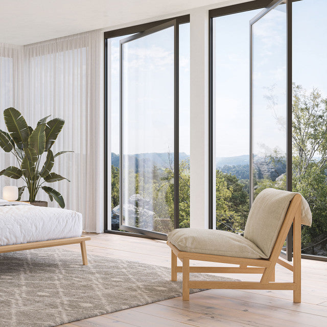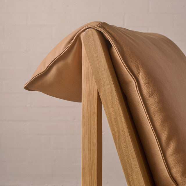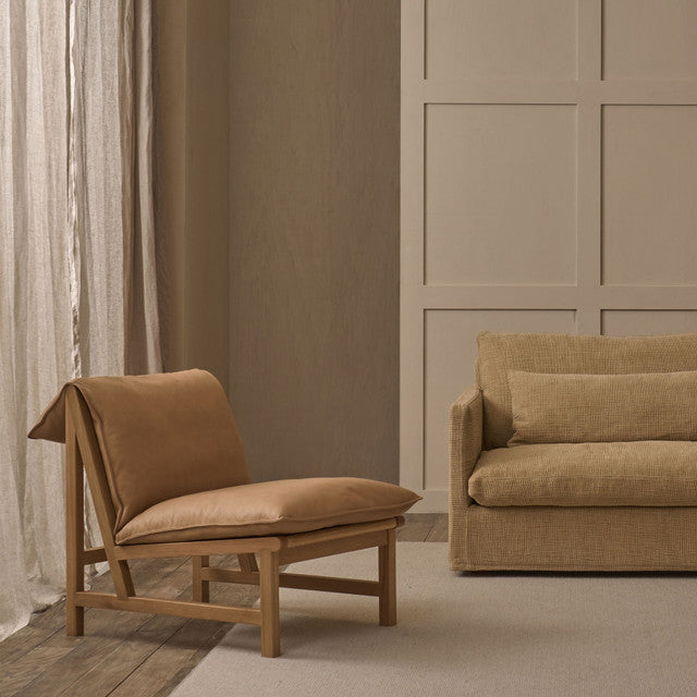 With its bold lines and relaxed posture, the Cantaloupe Lounge Chair invites contrast. A geometric oak frame provides architectural clarity, while plush cushions drape casually over woven webbing—merging structure with softness. The fold-forward backrest adds a considered touch of comfort.