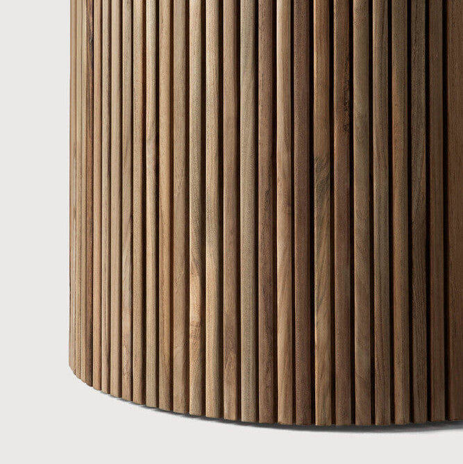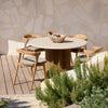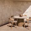 The Roller Max Outdoor Dining Table stands out with its stacked wood-stick design, combining natural elegance with functional durability. Its hand-finished concrete top pairs seamlessly with a reclaimed solid teak base, creating a timeless material mix that suits both indoor and outdoor spaces.