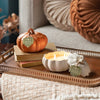 These Pumpkin Candles are a handcrafted ceramic design featuring a carved stem handle and organic gourd shape in two autumn colors. The fragrance is reminiscent of golden