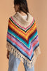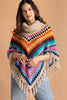 Introducing our Rainbow Crochet Turtleneck Sweater Poncho. Layer up in style with this rainbow crochet poncho, featuring a turtleneck collar and a fringed hem, and a colorful, comfortable choice for cooler weather. Pair with jeans or work attire to turn heads with this comfy & stylish layering piece.