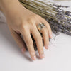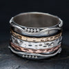 Sterling silver spinner ring with oxidized detail, three hammered mixed metal bands and ripple pattern. Our spinner rings are handmade with sterling silver and natural stones by silversmith artisans in Rajasthan, India. Inspired by the ancient prayer wheels of Tibet, you can spin the bands on your ring to reduce anxiety and support your own meditation practice.