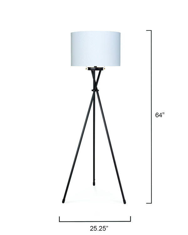 The versatile style of this airy, sculptural floor lamp with three intersecting legs gives off a Mid Century timeless vibe, paired with a white linen drum shade. Ships knock down, minor assembly required.