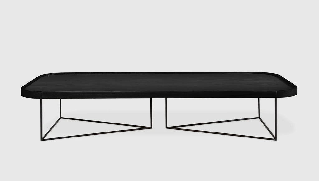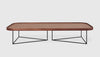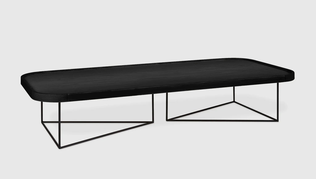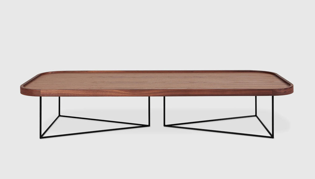 The Rectangular Porter Coffee Table offers an expansive, low-profile surface with refined, modern elements. It features a veneered wood top and a raised, solid wood edge detail with rounded corners. The eye-catching base features an architectural arrangement of two, powder-coated metal triangles. Part of the Porter Series, it is designed to nest with the Porter End Table.