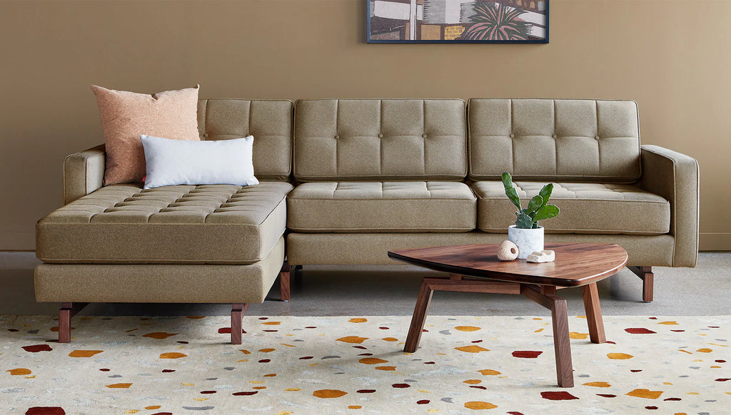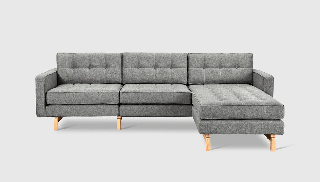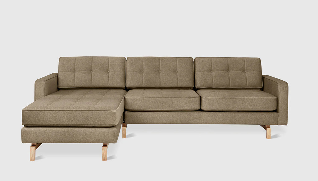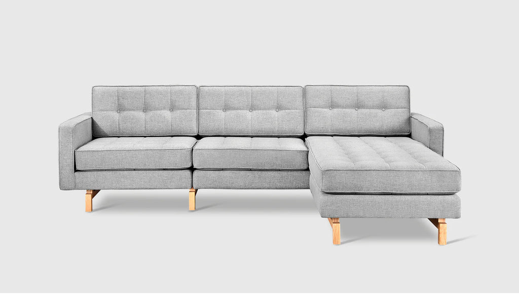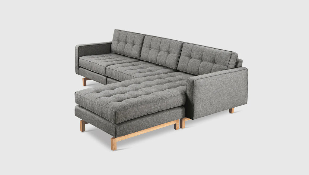 A modern update to the classic Gus* Modern Jane Series, the Jane 2 Bi-Sectional retains the iconic, mid-century look while adding contemporary enhancements. It has been cleverly designed so that it can be configured with the chaise on the left OR the right, depending on your floorplan. If your needs change, simply move the chaise and readjust the cushions to convert the design. Piped upholstery edges and button-tufted cushions create photogenic surface details that are enhanced by Jane 2 new, more refined proportions. A new wood base (available in light or dark wood finish) is inset on each piece, creating a sense of weightlessness that maximizes light and space. The frames are constructed with kiln-dried FSC®-Certified hardwood in support of responsible forest management.