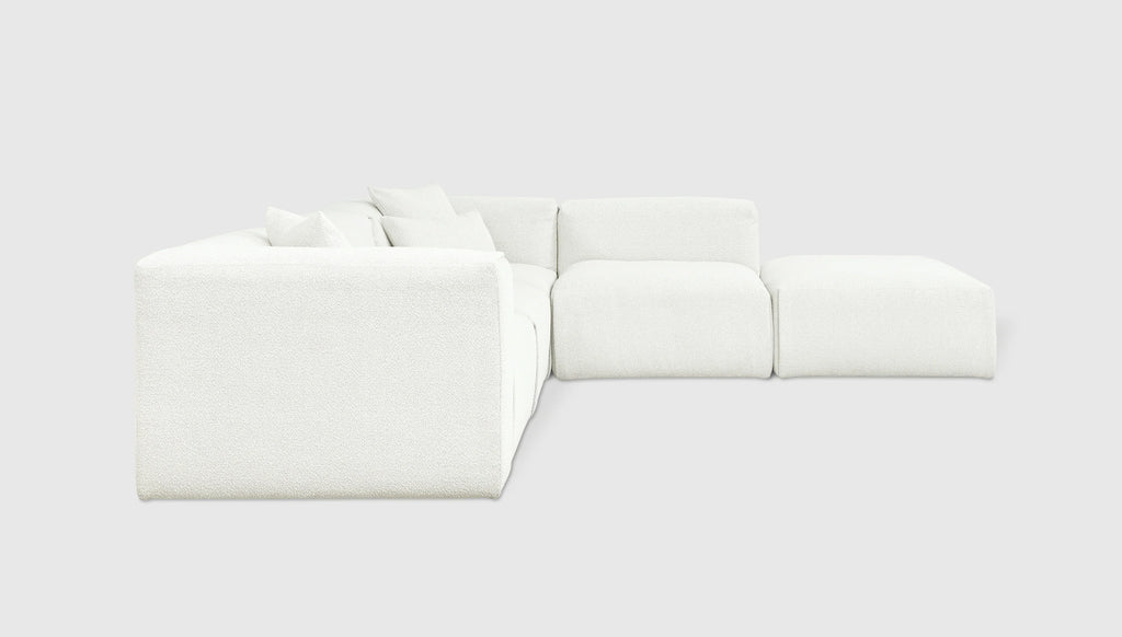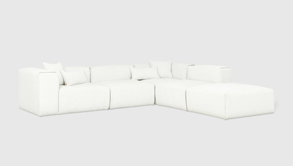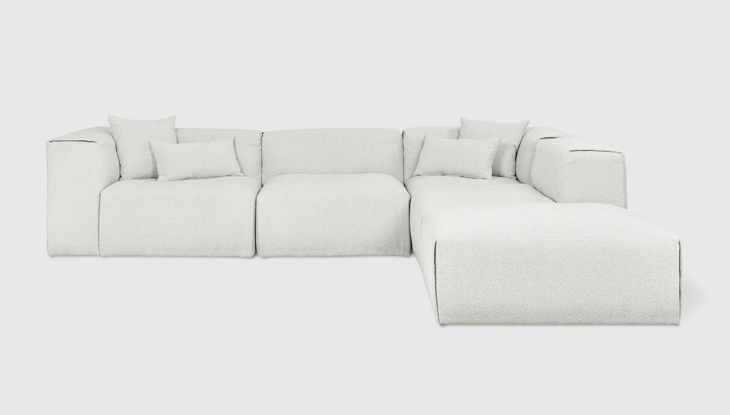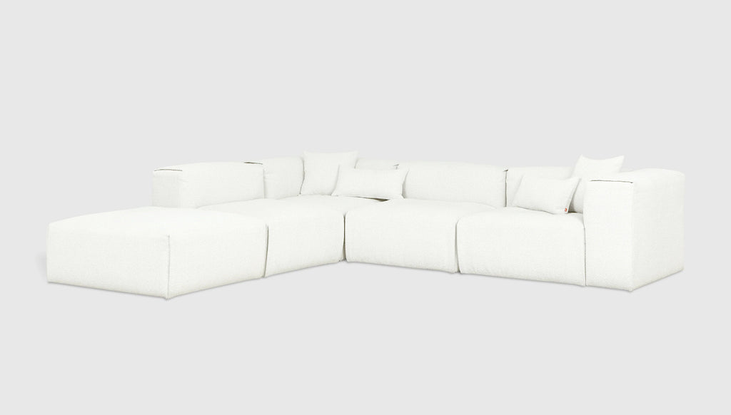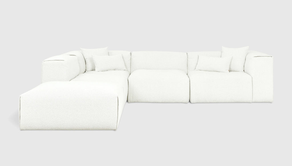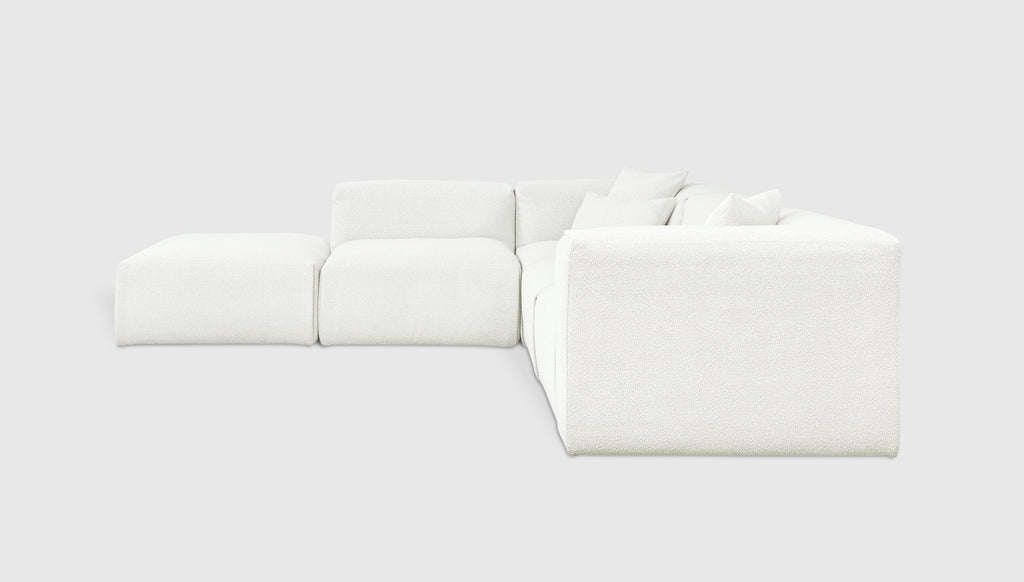 With plush comfort and a sophisticated, structured shape, our innovative Nest Modular Series invites you to sink in and stay awhile. The epitome of easy luxury, this versatile collection features five core components (Left Arm, Right Arm, Corner, Armless, and Ottoman) that offer near-endless configurations, allowing you to tailor your lounging experience to your evolving lifestyle. Each piece touts a plump low profile (courtesy of premium feather fill) encased in nubby bouclé fabric, with a Scandinavian-inspired modern shape that is versatile enough to hold court in a beach house, mountain escape, or boutique hotel lobby.