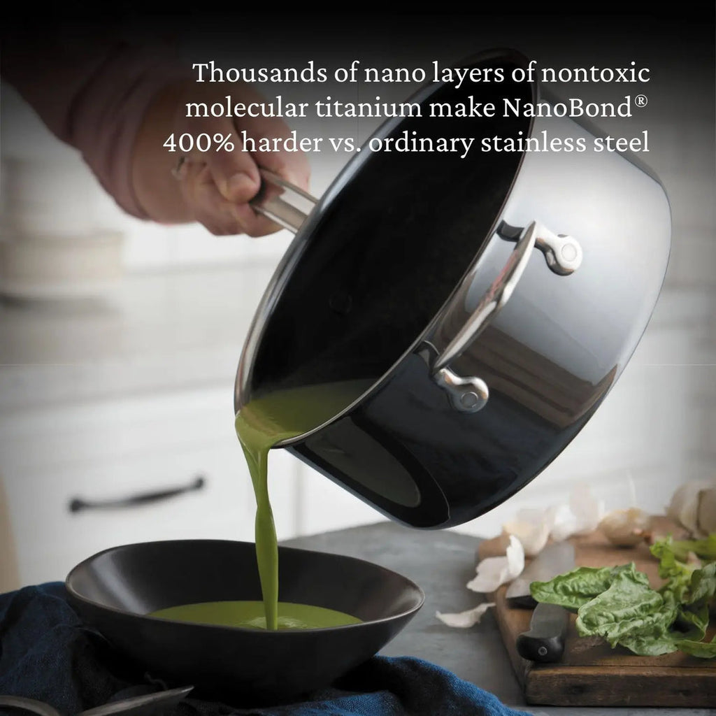 For groundbreaking innovations in cookware, equip the kitchen with a Hestan NanoBond Molecular Titanium Stainless Steel Saucepan. Available in 4 sizes, this lightweight saucepan is designed with a wider base for efficient heating and stirring, and sealed, flared rims for precision pouring. Molecular Titanium bonds thousands of titanium nano-layers to the 18/10 stainless steel construction, creating a brilliantly resilient cooking surface 4X harder than typical stainless steel, making it resistant to scratching, staining, and salt pitting. These 100% nonreactive pans are fitted with ergonomic handles for a comfortable grip when cooking and serving culinary creations. High heat and oven safe to a scorching 1050°F, these Italian handcrafted saucepans offer a lifetime durability for culinary perfection.