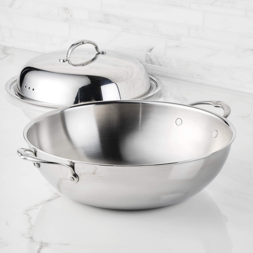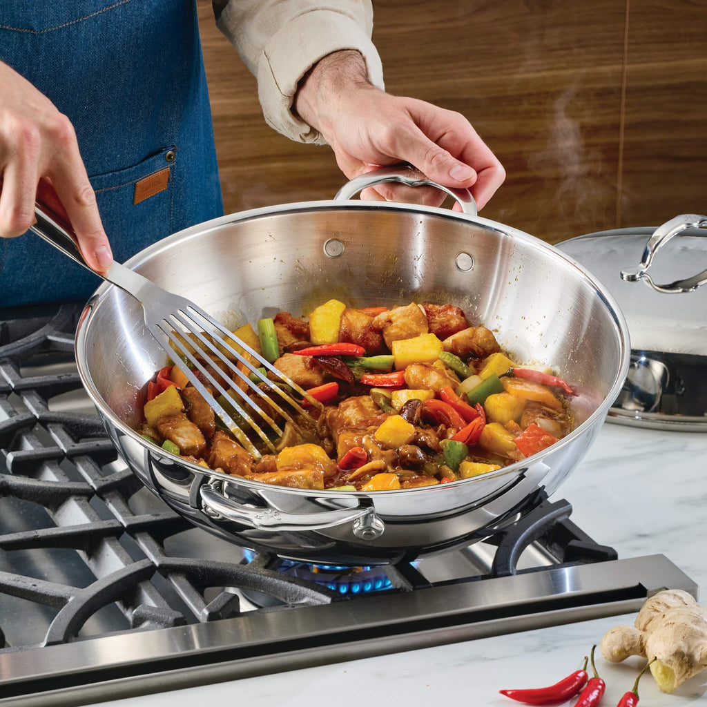 Purposeful innovation, functionality, and Italian craftsmanship converge in the ProBond® Luxe 14" Professional Clad Stainless Steel Wok with Dome Lid.