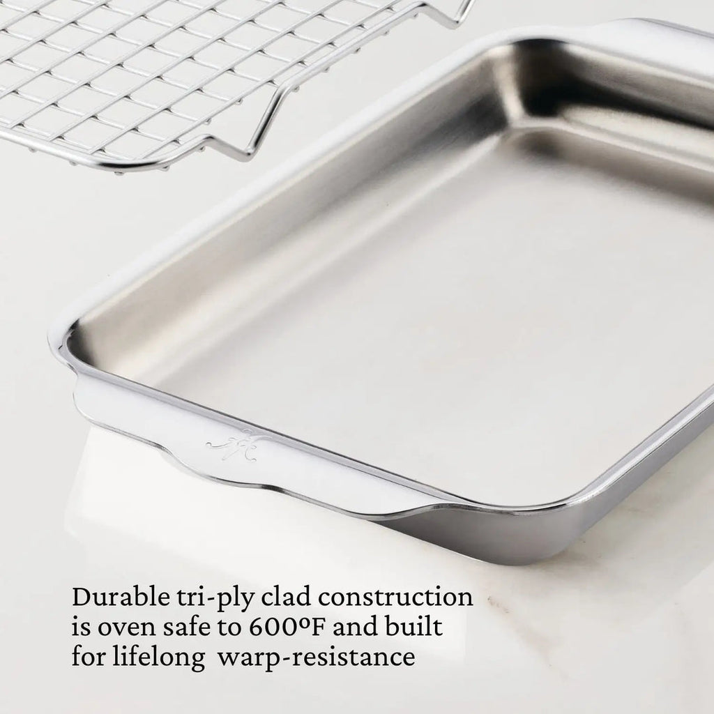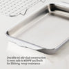 WARP-RESISTANT - Tri-ply clad stainless steel baking pans are thermal tested and engineered to be warp-resistant, maintaining their shape for a lifetime of oven baking and roasting