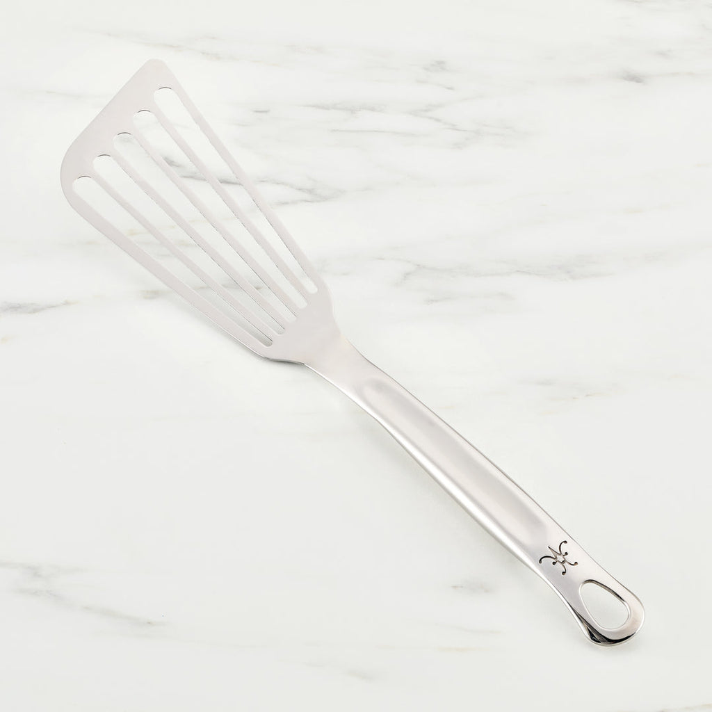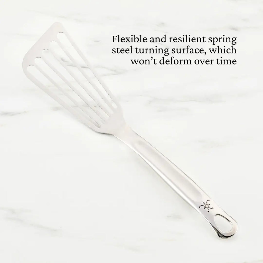 This 13-inch fish turner marries a beautifully ergonomic stainless steel handle and familiar detailing of Hestan cookware with the flexibility and resilience of the brushed spring steel in the slotted turning surface, which won’t deform over time. Our chefs and engineers meticulously refined the ideal offset angle, perfect beveled edge, degree of flexibility, and dual-toned finish to meet the standards demanded by Michelin-starred chefs for ease of sliding under even the most delicate foods. The artisan-polished finish complements Hestan’s signature hanging loop and elegantly embossed monogram, making this fish spatula easy to admire.