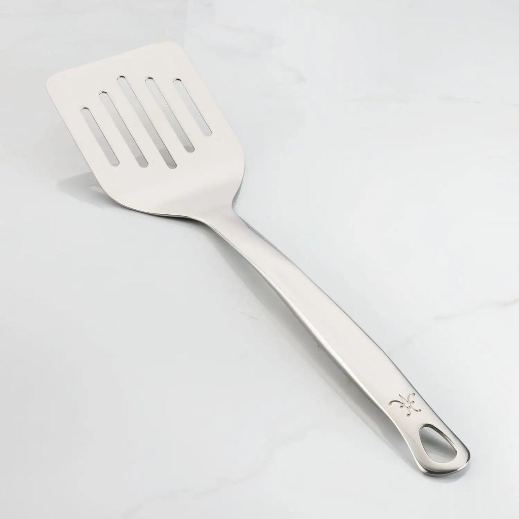 This 13-inch slotted turner features a beautifully precise stainless steel handle and finely beveled-edge blade that easily slides under food. With artisan-polished finish and Hestan monogram, it is easy to admire.