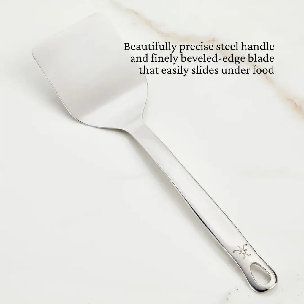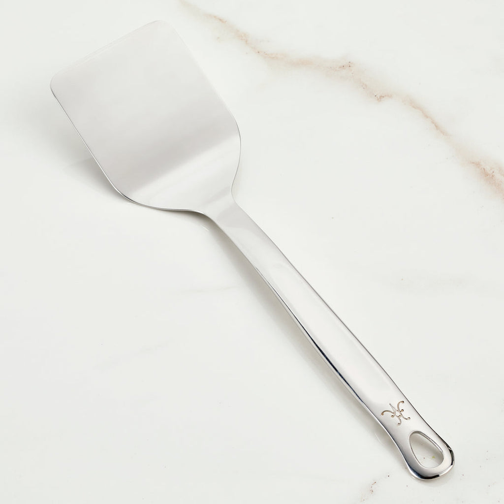 This 13-inch solid turner features a beautifully precise stainless steel handle and finely beveled-edge blade that easily slides under food. With artisan-polished finish and Hestan monogram, it is easy to admire.