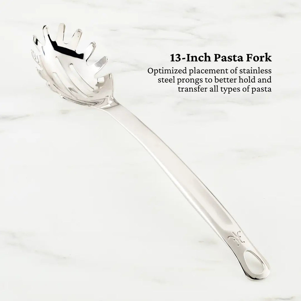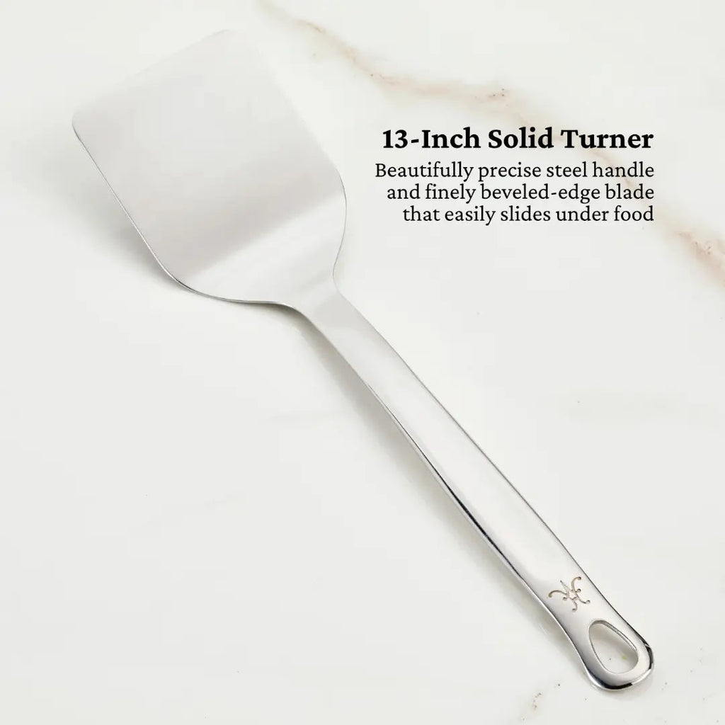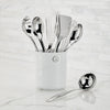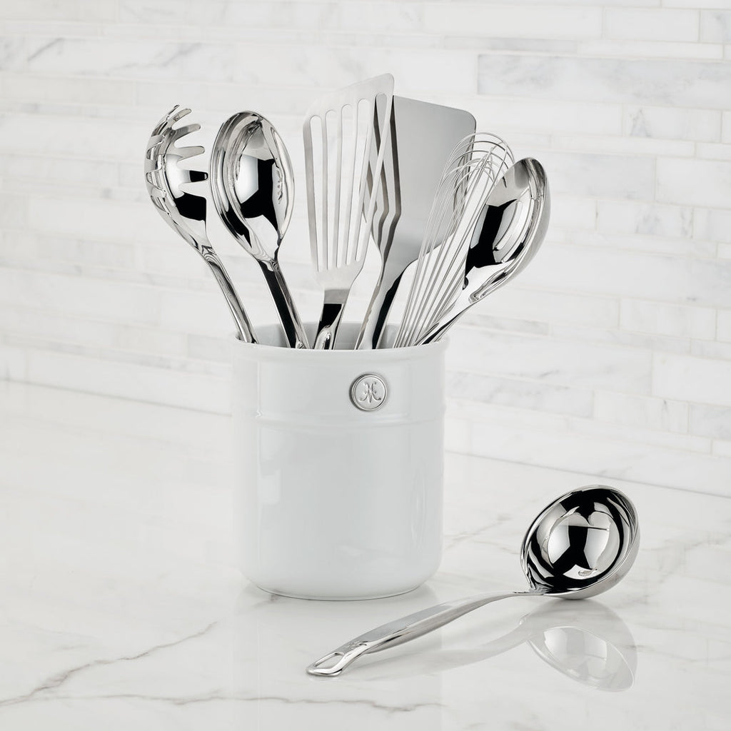 The 8 Piece Ultimate Tool and Bain Marie Set includes a 13-inch Stainless Steel Solid Spoon, Slotted Spoon, Ladle, Pasta Fork, Solid Turner, Fish Spatula, and French Whisk. Each utensil is crafted with the same high standards of Hestan cookware, offering supreme comfort and precision. From the precise angling of the steel turner and the enduring flexibility of the spring steel fish spatula to the re-engineered solid spoon and pasta fork, every piece is designed to inspire and delight. The set also features an optimally weighted steel ladle and a French whisk with longer, reinforced tines. Each tool's artisan-polished finish adds unmatched elegance. Completing the set is an extra-large porcelain Bain Marie utensil holder, crafted from rare minerals and kiln-fired at 2,300ºF for superior durability and chip resistance.