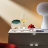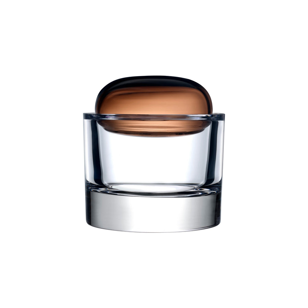 Part of the NUDE Ecrin series designed by Sebastian Herkner, this medium-sized container offers an elevated sense of sophistication and elegance. Hand-crafted from crystalline glass, this precious piece stands out with its commanding, heavy base, a curved profile and a colour-infused lid, which recalls the shape of the Ritten rock formations – an impressive natural monument in South Tyrol.