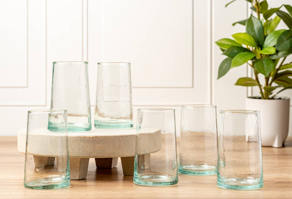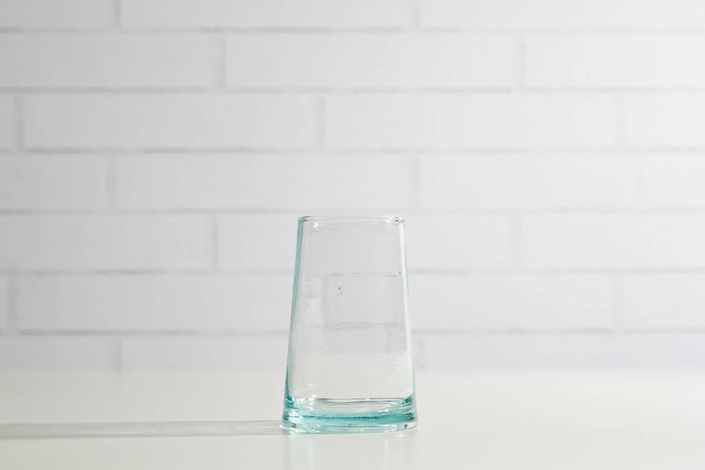 The sleek, simple design of these hand-blown cone-shaped glasses is a testament to the style and skill of the artisans who craft them. Used for all types of beverages or as little vases to decorate each table setting, you will enjoy the feel of them in your hand as you toast the joys of the day. The handblown construction is evident in the bubbles suspended in the glass itself and in the organic forms that the vessels take. Made from recycled beer and wine bottles, these glasses are a second act for glass that would otherwise be sent to landfills. Large Cone: bottom diameter 3", top diameter 2.5" / 4.75" height.