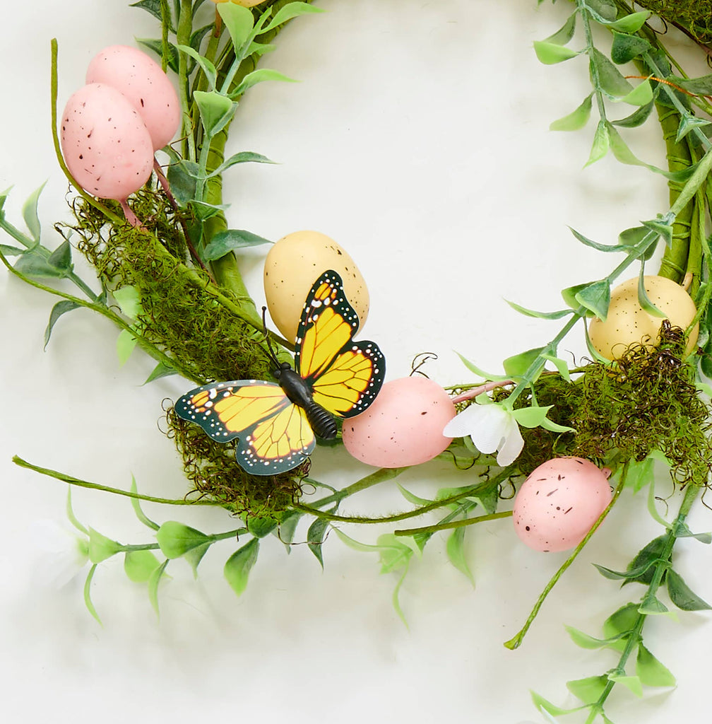 Add a festive touch to your décor with this 4.25" Easter Eggs, Butterflies, and Moss Pillar Candle Ring Centerpiece. Perfectly sized for pillar candles, it features charming Easter accents and is wired for easy shaping. A beautiful centerpiece for your spring celebrations.