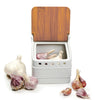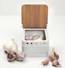 Made of stoneware with a bamboo lid.Measurements: 4.5 inches by 4 inches by 4.5 inches tall.Store garlic, fresh ginger, or shallots.Fits 2-3 heads of garlic.Hand washing is recommended.