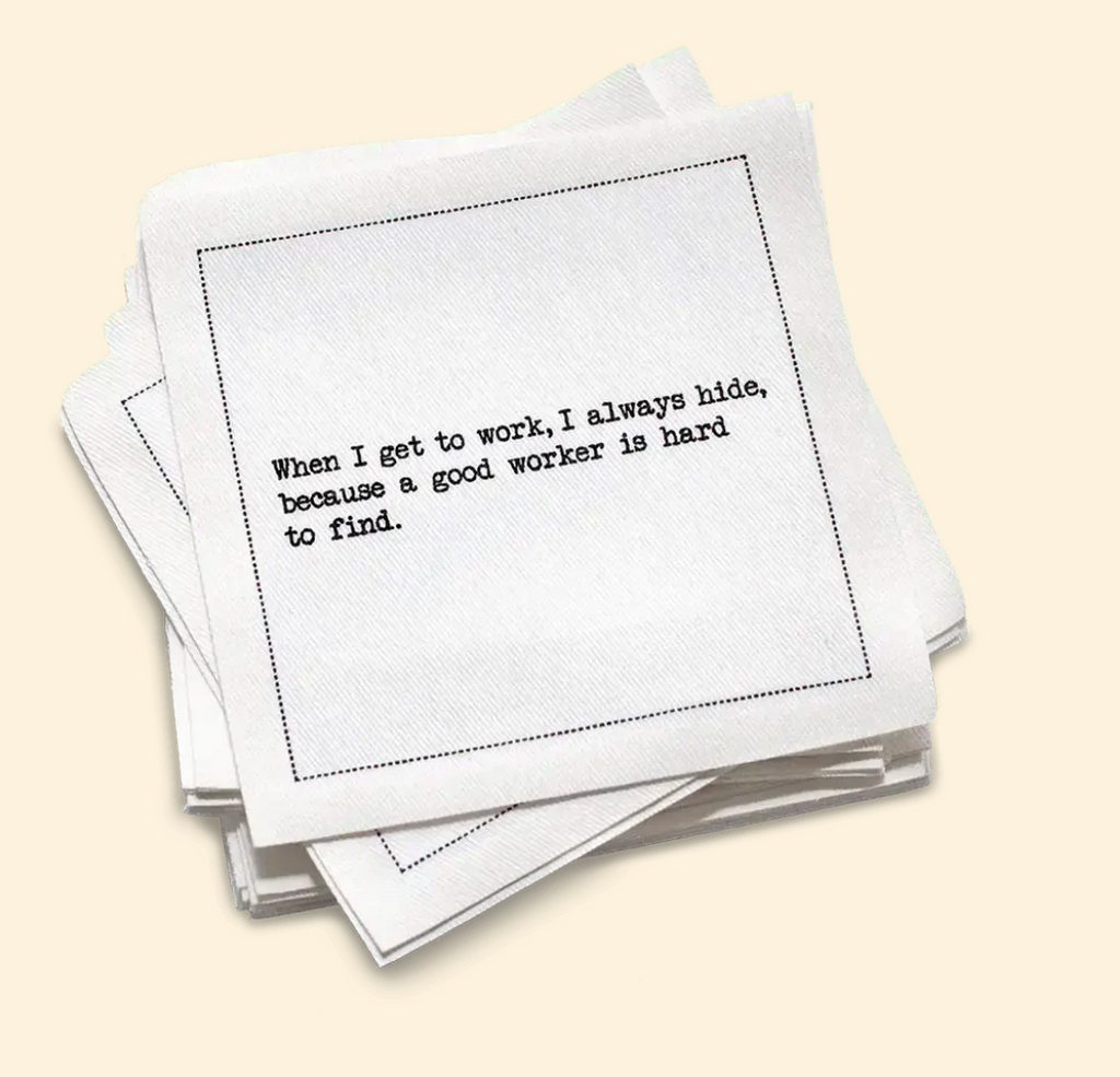 Add a splash of wit and irreverence to your next gathering! These luxurious white cotton cocktail napkins from Five Star Napkins feature clever and cheeky “Inappropriate Thoughts” quotes—perfect for guests who appreciate humor served with their drink.