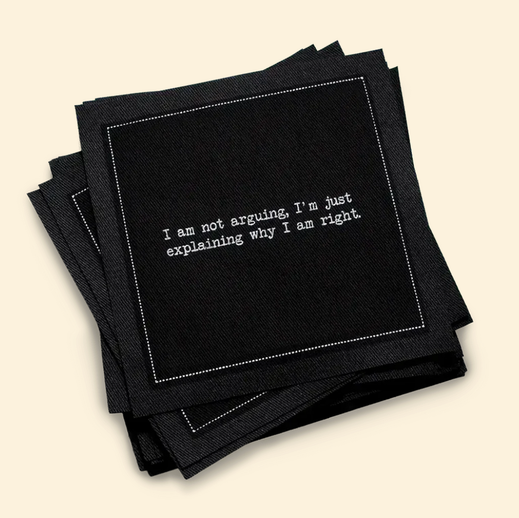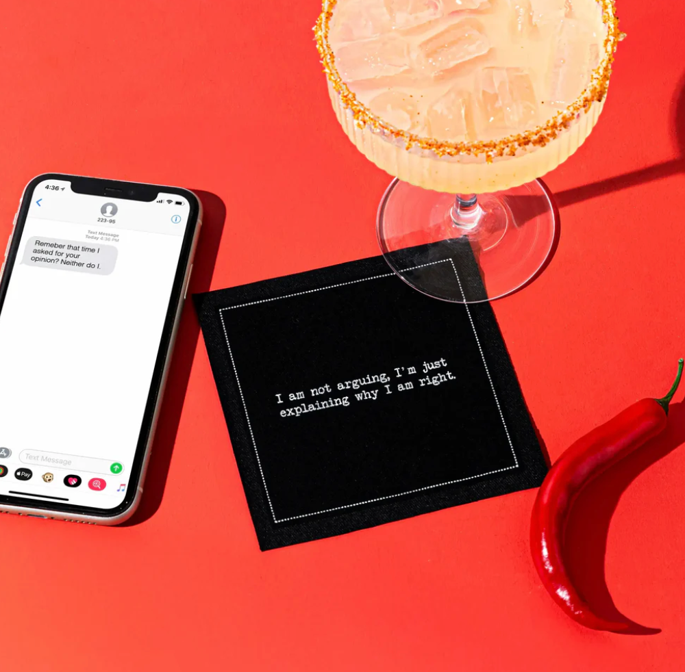 Made from soft, cloth-like black cotton, these cocktail napkins add a chic, modern edge to any bar setup or party table. Each napkin is printed with a clever, laugh-out-loud quote that’s sure to get people talking (and maybe rolling their eyes).