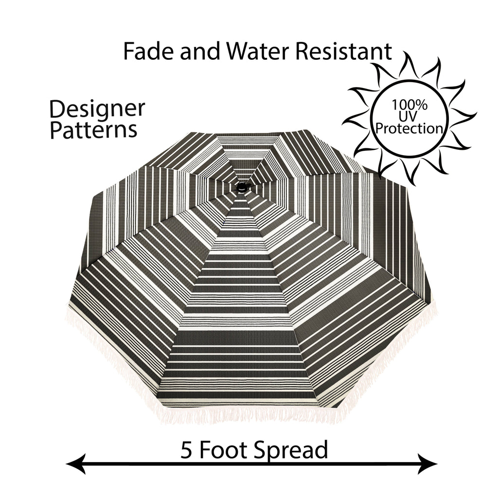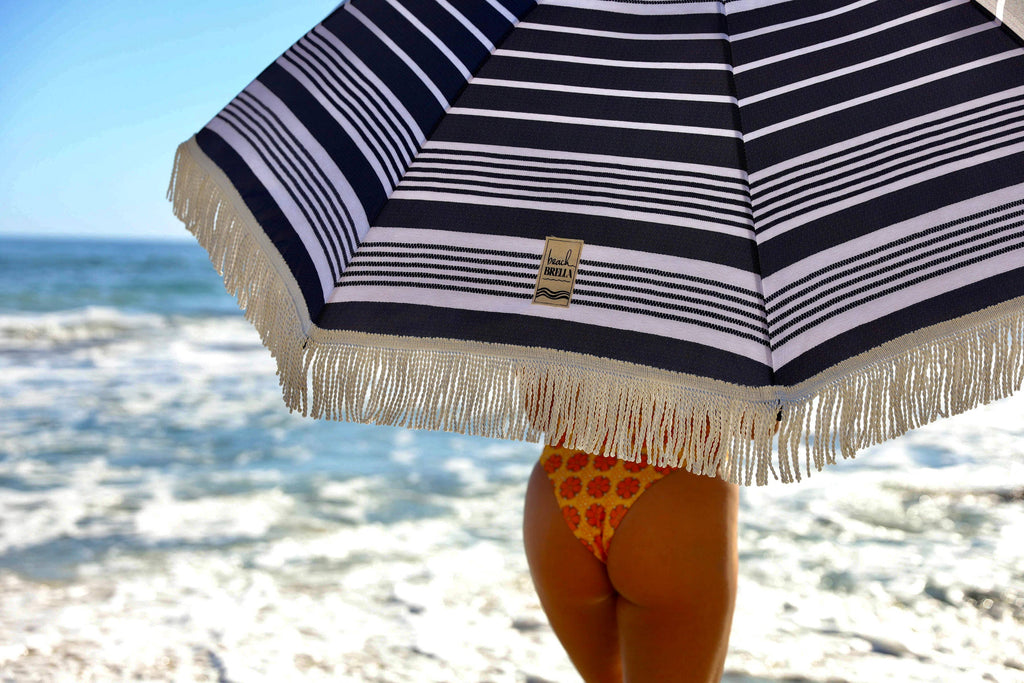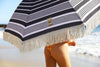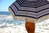 The Broadway beach umbrella features a linen texture with a classic black-and-white stripe, adding some sophistication to your beach day.
