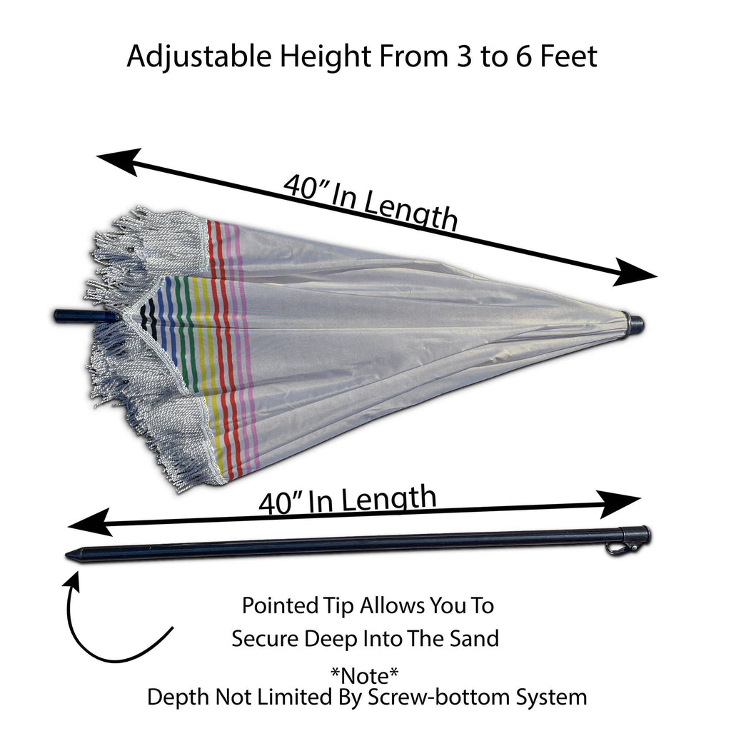 Height adjustable, 60" diameter, sand anchor, and stylish denim carry bag.