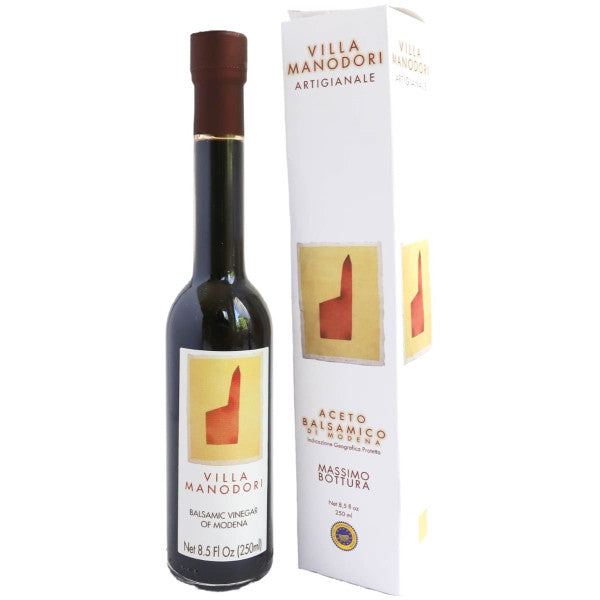 Created by world‑famous, three‑Michelin‑star chef Massimo Bottura, Villa Manodori “Artigianale” Balsamic Vinegar of Modena IGP is an authentic expression of Modenese tradition. Trebbiano grape must and select red‑wine vinegar are patiently aged for nine years through a succession of oak, chestnut, and juniper barrels. The result is a glossy, deep‑brown elixir with a lush, syrupy body, seductive aromas of dried fruit and wood, and a perfectly balanced sweet‑tart flavor that lingers on the palate.