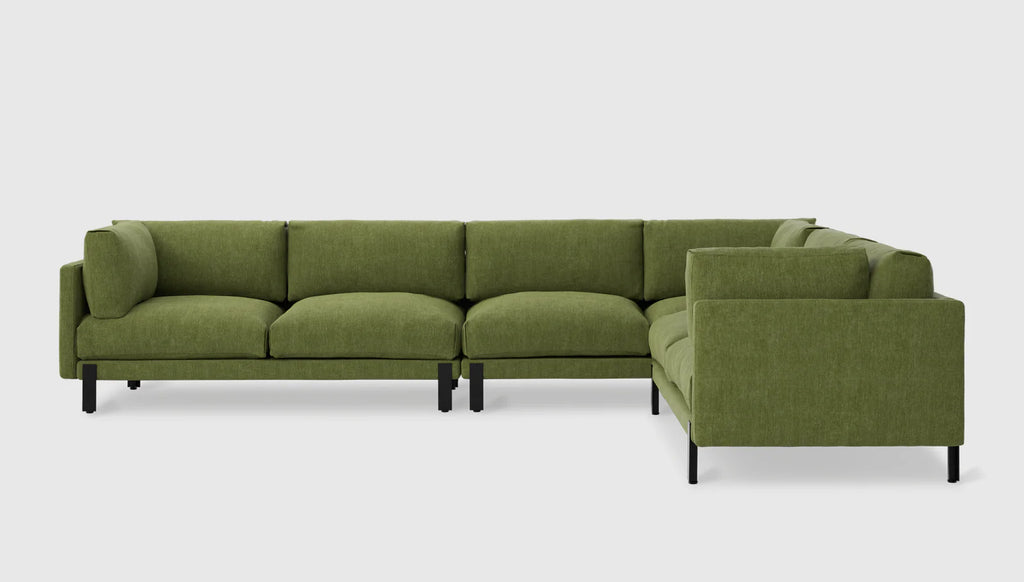 The Silverlake Upholstery Collection is a Scandinavian-inspired seating design that strikes an elegant balance between minimalist styling and a casual, inviting feel. The design features a slender tuxedo frame, and plush seat and back cushions filled with our eco-friendly, signature PET fill. The back and side cushions can be adjusted to your preferred angle, while the generous seat depth enhances the sofa's or sectional's comfort. Subtle features like pleated fabric details on cushion corners and architectural, black powder-coated steel legs complete Silverlake, laid-back modern aesthetic. The collection is a restful haven for any busy home, office or lobby. The frames are constructed with kiln-dried FSC®-Certified hardwood in support of responsible forest management. Silverlake uses a clean, ultra soft, long-strand fiber fill material that offers the comfort and feel of traditional waterfowl down. This material is created through a process that benefits the environment by diverting 929 plastic bottles away from landfills, waterways and oceans for each Silverlake Sectional we build.