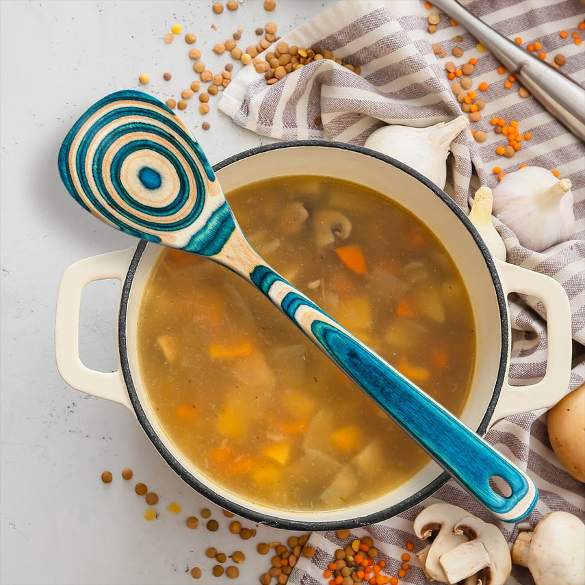 Bring a touch of the Mediterranean to your assortment with the Baltique® Mykonos Collection Wooden Cooking Spoon from Totally Bamboo. Masterfully crafted from layered birch wood and colored with food-safe materials, this eye-catching cooking spoon features a stunning blend of tranquil blue and natural wood tones, inspired by the serene beauty of the Greek island. It's perfect for someone seeking standout kitchen utensils, thoughtful gift ideas, or artisan kitchenware. At 12.5 inches long, it's ideal for stirring, serving, and everyday cooking. The smooth finish is safe for all cookware, including non-stick.