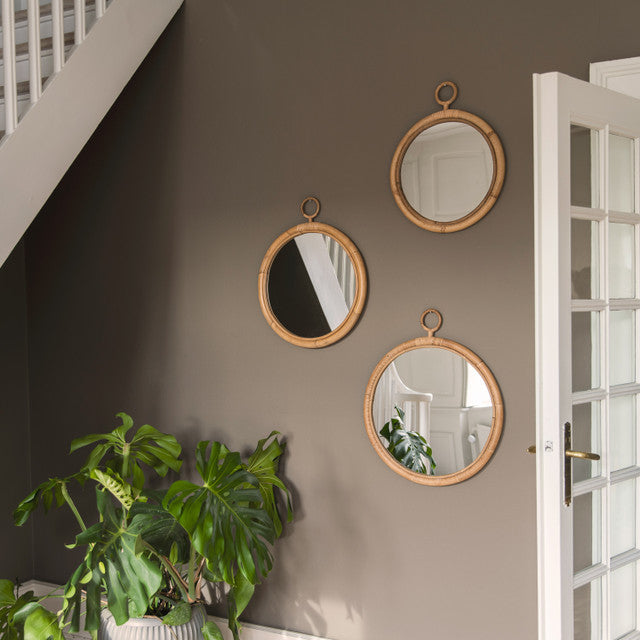 The Ella Mirror by Sika Design brings minimalist elegance to a favorite space. In the Atomsphere collection, this design draws inspiration from found sketches from the 1950s and 1960s. This updated version is handmade by skilled rattan artisans and features a round, double-rattan frame bound to a ring top. Available in small, medium, or large sizes, the Ella makes a statement in a small entryway or powder room, or can be combined in all three sizes as part of an eclectic gallery wall.
