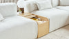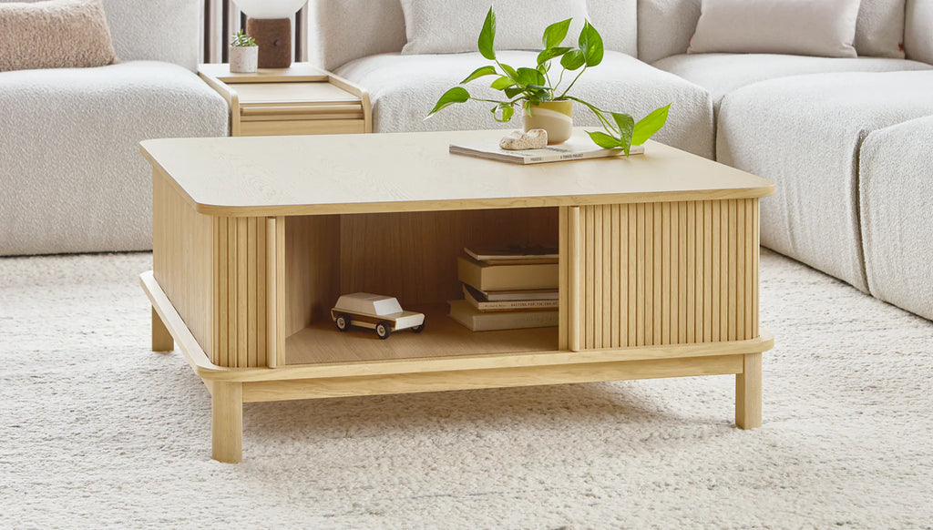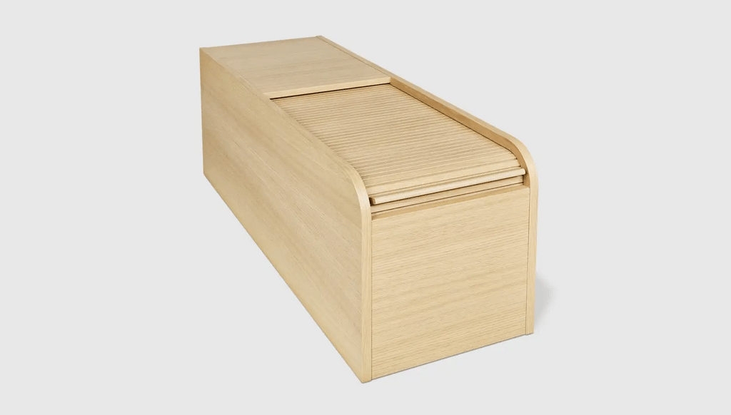 Stylishly reveal or conceal with Ledger, a contemporary storage design that showcases a gorgeous tambour wood sliding top and curved waterfall edge. The Ledger Storage Box is designed to integrate with the Nest Modular Seating collection, providing a functional storage solution for Nest configurations large or small. Position between Nest components to provide a surface for entertaining and to store blankets, books or electronics. The tambour door, which opens smoothly into the back of the storage box, proves that beautiful form follows function, displaying a simplicity of design engineering without the use of hardware and fasteners. The warm woodgrain is protected with an all-natural, zero VOC finish. Solid and engineered wood throughout is FSC ®-Certified, ensuring material is sourced from well managed forests to support a healthy environment.