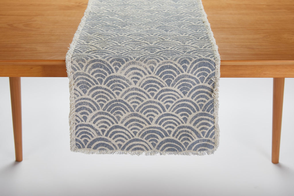 Style your table with rustic charm! This 100% cotton table runner features a Tableau-exclusive design—a pattern of scalloped waves on a misty blue background! It's the perfect way to add a unique accent to your everyday decor. Pair it with other items in our Nautical & Lake Living collection for a beach-inspired atmosphere!