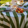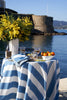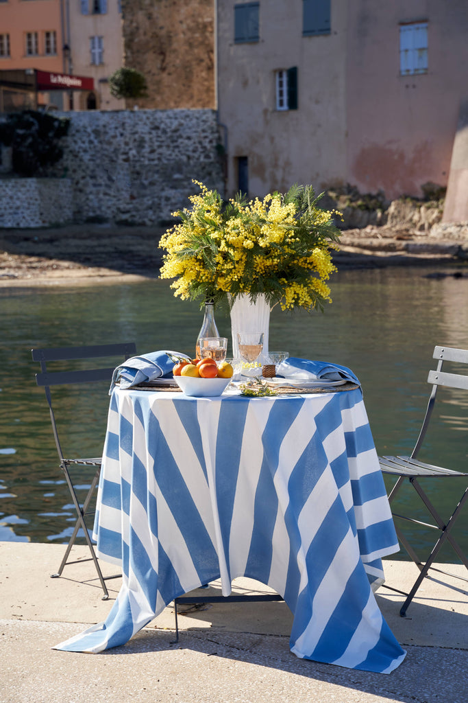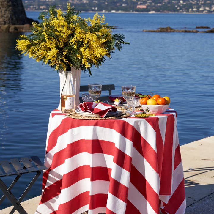 Transform your dining experience with the St. Tropez tablecloth, available in four stunning colors. Handcrafted with care, this piece features timeless broad cabana stripes, effortlessly bringing a touch of French sophistication to any meal. Made from a durable blend of heavyweight linen and cotton, it combines both luxury and practicality. Whether it's for a cozy family dinner or a lively Fourth of July celebration, this machine-washable tablecloth is designed for easy care without compromising on style. Elevate your table setting with the St. Tropez tablecloth, where beauty meets functionality.