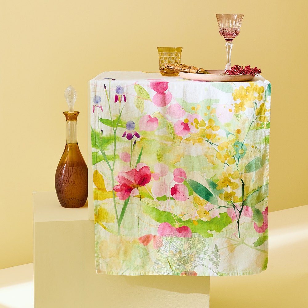 Delicate florals and blossoms float in shades of white, green, yellow, purple, and pink on the Souffle Fleuri Printemps Table runner by Garnier Thiebaut. Crafted from hand-drawn artwork by Garnier Thiebaut's in-house artisans in France, this printed design blends the softness of cotton with the strength of linen, creating a durable and effortlessly elegant addition to any table.