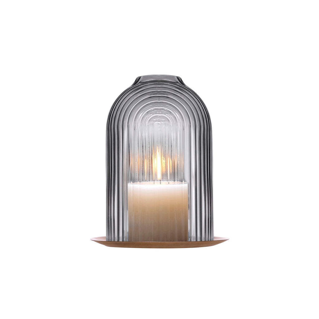 Perfect for indoor and outdoor displays, this medium NUDE Ilo candle holder comprises a clear crystalline dome, enriched with a hand-engraved ripple pattern, resting atop a light-reflective copper base. It can be used alone or combined with other pieces from the range for a captivating effect.