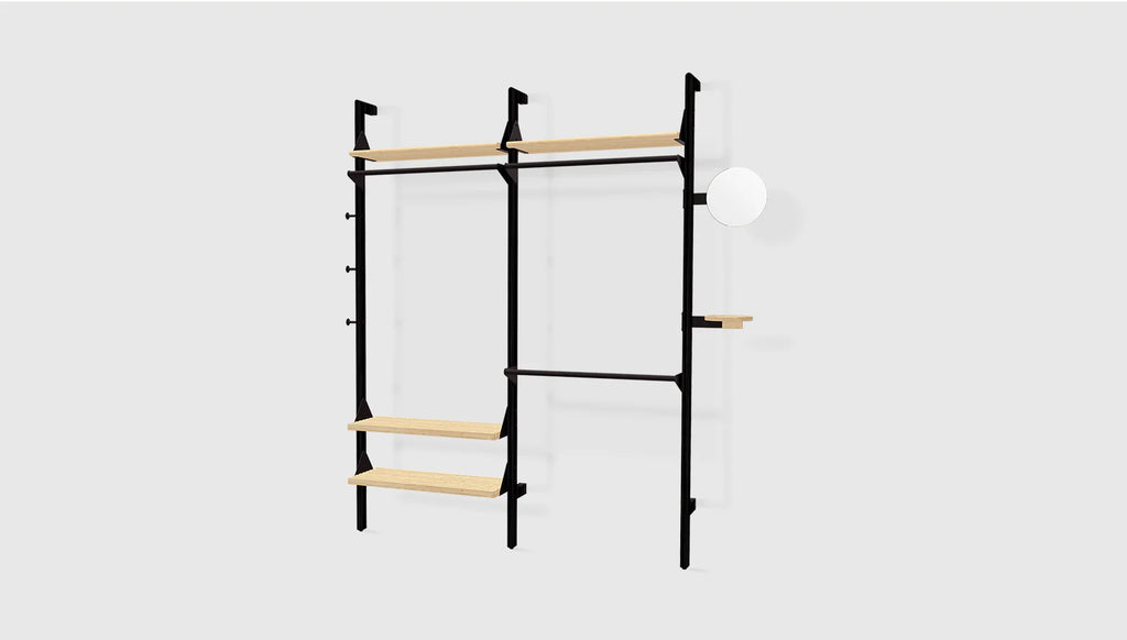 - Comprised of: 3 Branch Uprights, 2 Slatted Shelves, 2 Shelves, 3 Hangbars, 1 Side Mirror, 1 Side Tray and a set of 3 Single Hooks.