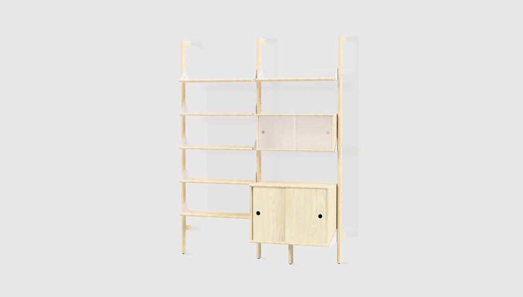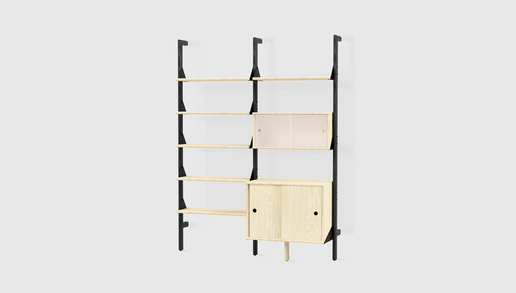 The award-winning Branch Modular Organization System effortlessly blends mid-century style with versatility for a modular piece that gives you an infinite number of elegant storage options for home, office or retail environments. The design features varying configurations that can be transformed into a wide range of organization or display units including bookshelves, desks, and wardrobes. Add-ons like closed-door cabinets allow you to further customize the size, layout, and function of the system to perfectly suit your space. Thoughtfully refined details, such as rounded edges on the shelves and frosted door fronts, soften Branch's aesthetic and enhance its architectural style. Straightforward installation means you can spend more time perfecting your vision and display and less time stressing over instructions.