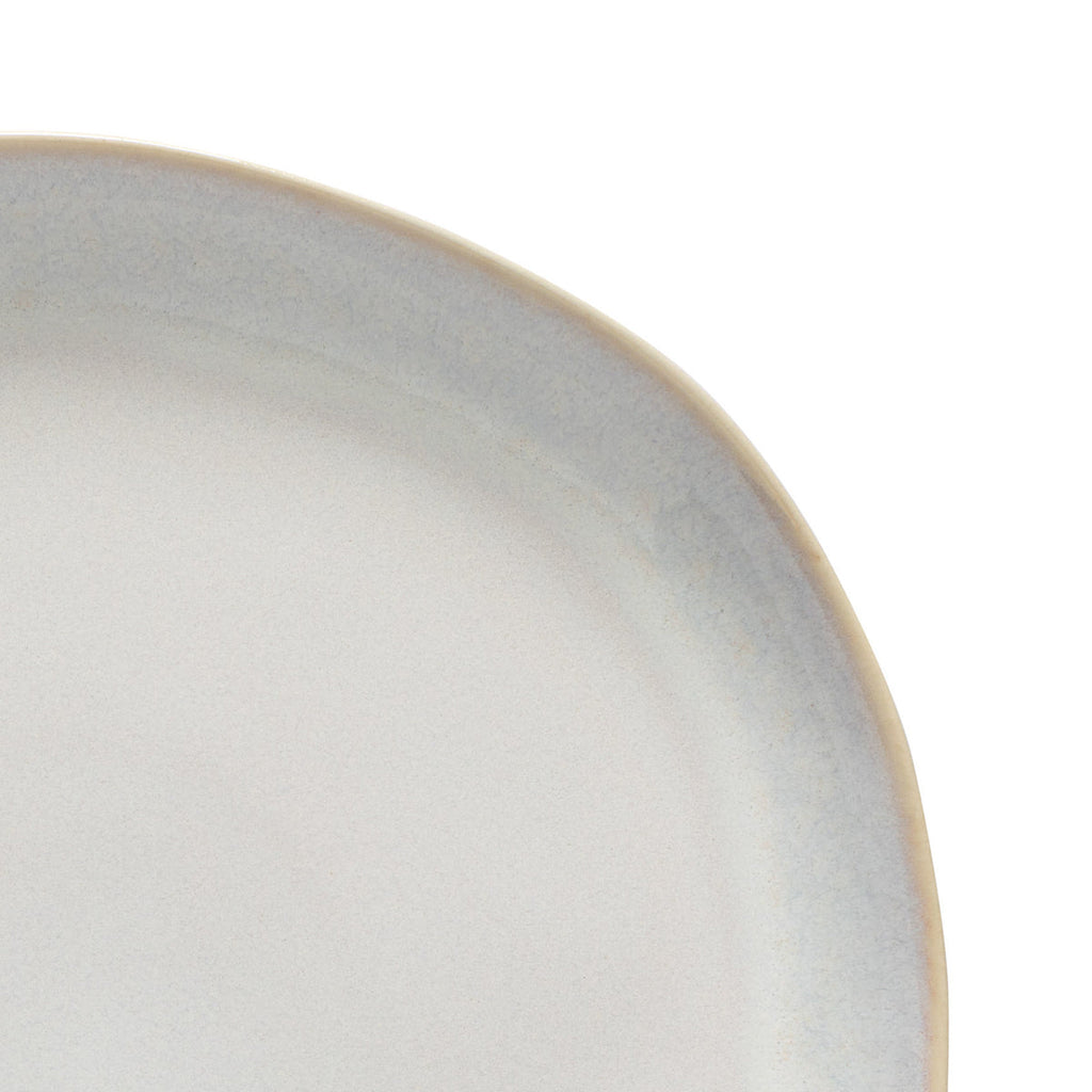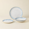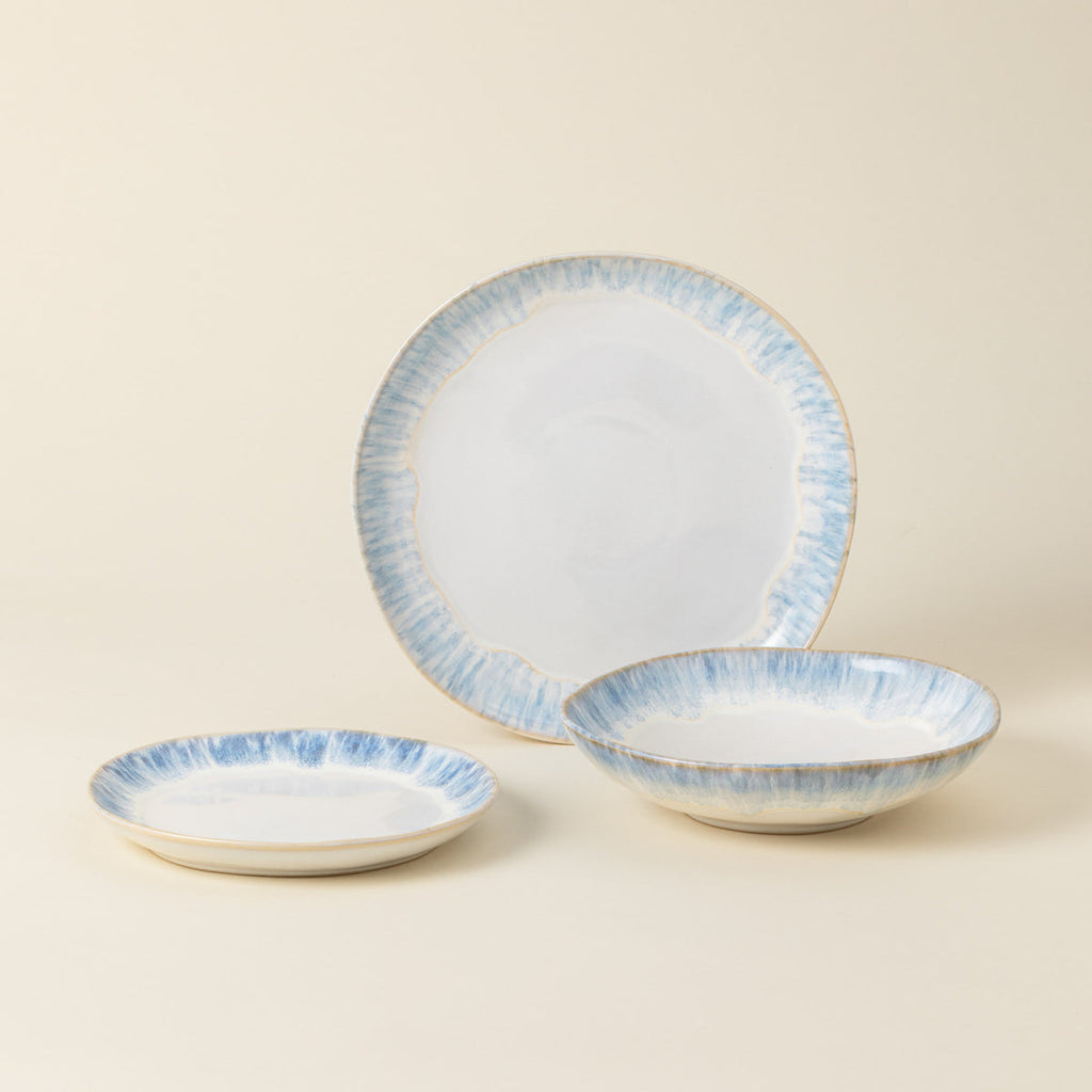 The Brisa 12 Piece Place Setting with Pasta Bowl, handcrafted in Portugal from fine stoneware, features organic shapes inspired by the Algarve Coast. Its reactive glaze in white and blue creates a unique finish, ensuring that no two pieces are alike.