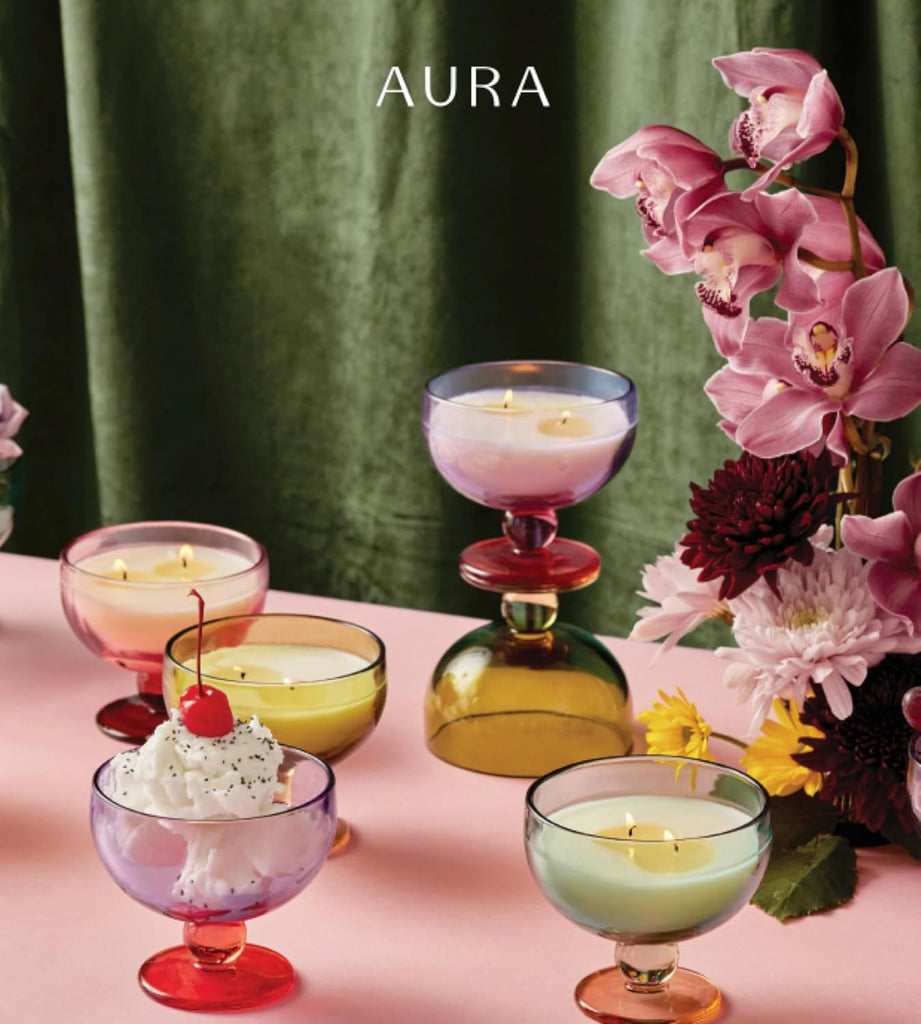 Uplift the atmosphere of any room with the Aura 6 oz. Candle. This 2-wick candle is the perfect statement piece for your home, with elements of vintage glassware, vibrant jewel tones, and luxurious, sweet fragrances. The Glass Color is teal and Orange.