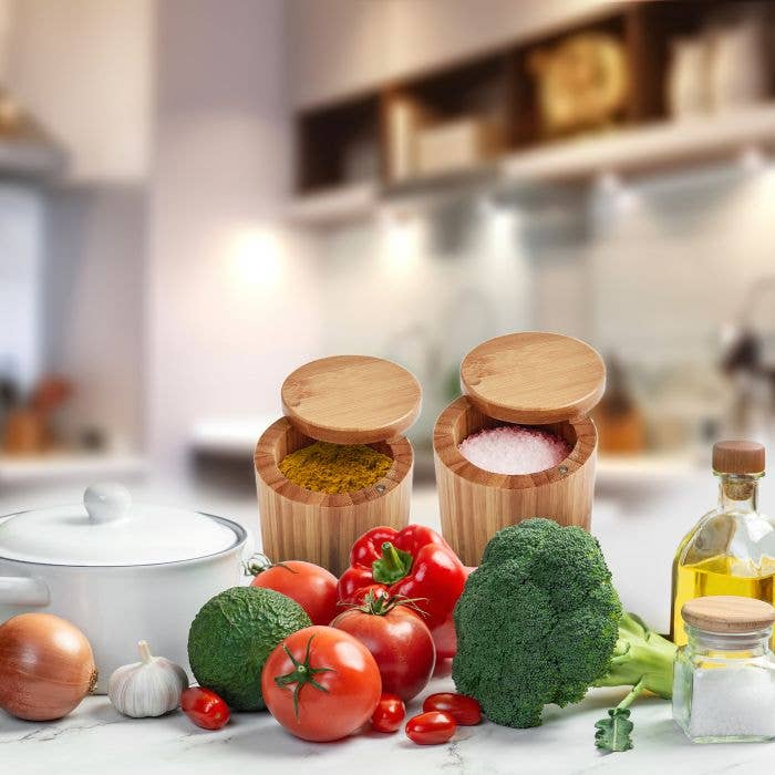 HIC Kitchen’s Bamboo Salt Box keeps your favorite cooking salts close at hand. Holding approximately 7 ounces, it’s perfect for table salt, kosher salt, Himalayan pink salt, sea salt, smoked salt, and more. The attached lid rotates 360° for one-handed access, while the magnetic closure keeps contents fresh between uses. A matching 3.78-inch spoon is included for easy portioning. Made from natural bamboo, it’s beautiful enough for countertop display or serving at the table.