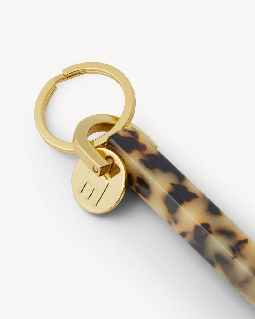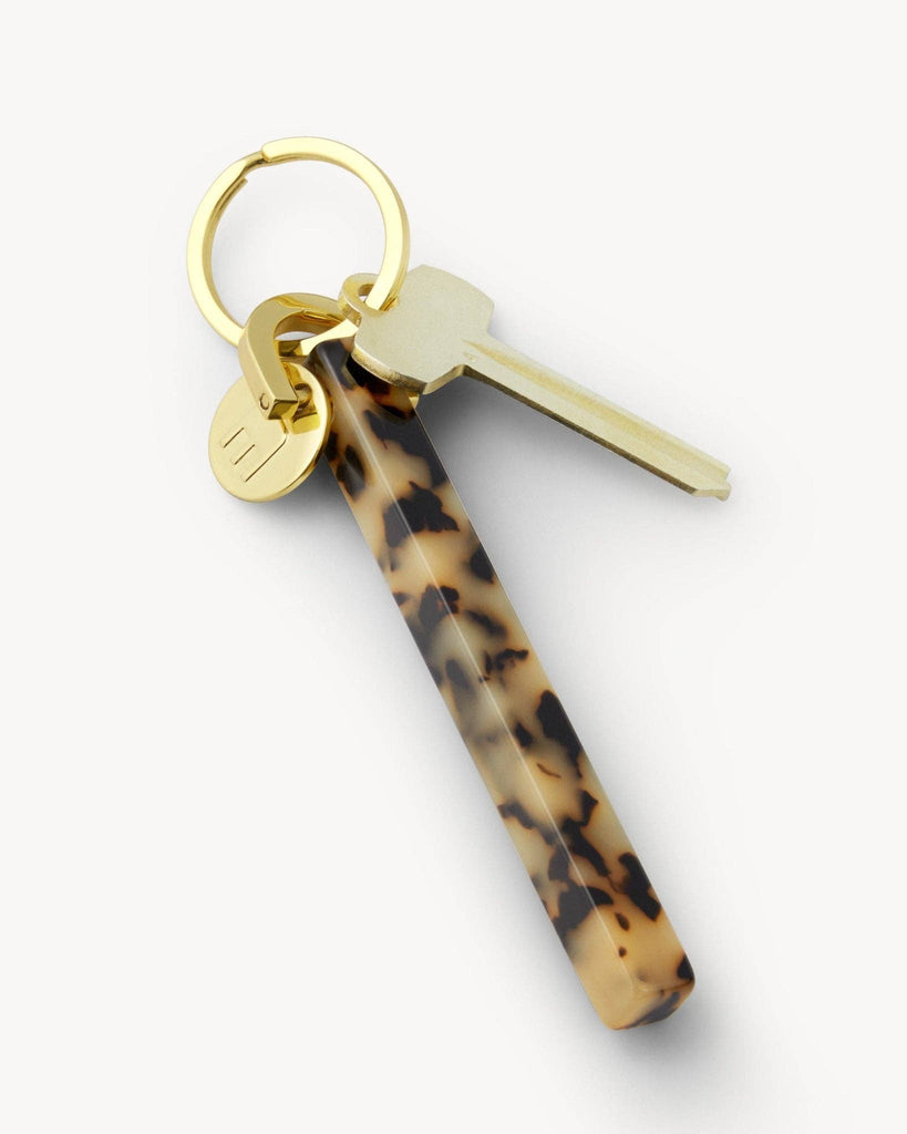 A classic bar keychain, handmade from fine Italian acetate with gold hardware. - Handmade from Italian acetate - Gold plated hardware - Bar length: 5" inches - Bar width: .375" inches - Ring diameter: 1" inch